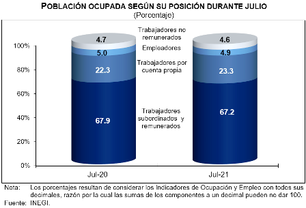 Con cifras desestacionalizadas y en comparación con el mes inmediato anterior, en julio de 2021 la Tasa de Desocupación registró un incremento de 0.1 puntos porcentuales al ubicarse en 4.1%, y la Tasa de Subocupación aumentó 0.3 puntos porcentuales, al establecerse en 12.7 por ciento.