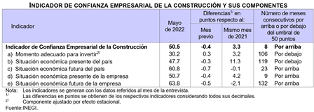 En mayo de 2022 y con cifras desestacionalizadas, el Indicador de Confianza Empresarial de las Manufacturas creció 0.1 puntos respecto a abril, el ICE del Comercio descendió 3.8 puntos, el de los Servicios Privados no Financieros, 1 punto, y el de la Construcción se redujo 0.4 puntos.