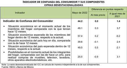 En mayo de 2022 y con datos ajustados por estacionalidad, el Indicador de Confianza del Consumidor (ICC), elaborado de manera conjunta por el INEGI y el Banco de México, fue de 44.2 puntos, mismo nivel que el mes previo.