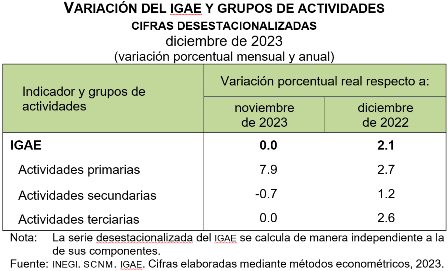 En diciembre de 2023 y con cifras desestacionalizadas, el IGAE no registró variación a tasa mensual.