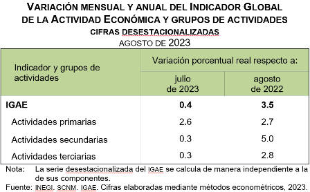 En agosto de 2023 y con cifras desestacionalizadas, el IGAE incrementó 0.4 % a tasa mensual.