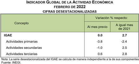 En febrero de 2022 y con cifras desestacionalizadas, el Indicador Global de la Actividad Económica (IGAE) no presentó variación a tasa mensual.