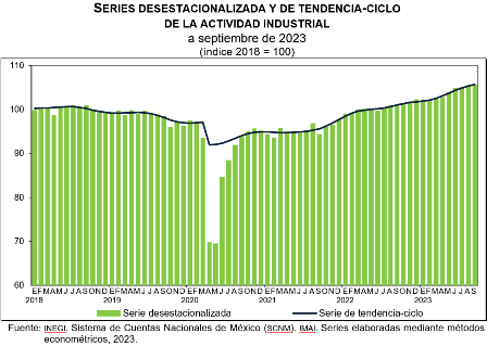 En septiembre de 2023 y con cifras desestacionalizadas, la actividad industrial aumentó 0.2 % a tasa mensual.