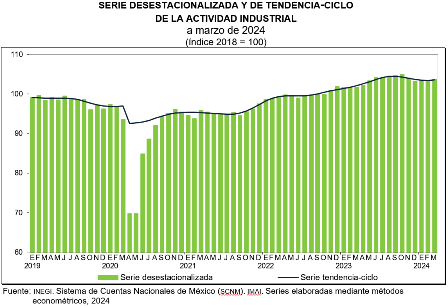 En marzo de 2024 y con cifras desestacionalizadas, la actividad industrial aumentó 0.6 % a tasa mensual.