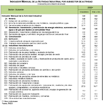 En diciembre de 2022 y con cifras desestacionalizadas, el Indicador Mensual de la Actividad Industrial (IMAI) aumentó 0.7 % a tasa mensual.