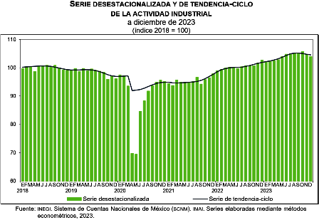 En diciembre de 2023 y con cifras desestacionalizadas, la actividad industrial descendió 0.7 % a tasa mensual.