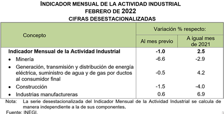 En febrero de 2022 y con cifras desestacionalizadas, el Indicador Mensual de la Actividad Industrial (IMAI) disminuyó 1% a tasa mensual.
