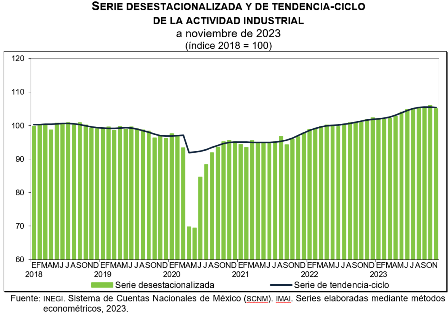 A tasa anual y con cifras desestacionalizadas, la actividad industrial incrementó 3 %, en términos reales, en noviembre pasado. Por sector de actividad económica, Construcción avanzó 19.3 % y Generación, transmisión, distribución y comercialización de energía eléctrica, suministro de agua y de gas natural por ductos al consumidor final, 5.7 por ciento. Industrias manufactureras redujo 0.4 % y Minería, 2.3 por ciento.