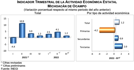 Durante el tercer trimestre de 2022, la actividad económica de Michoacán de Ocampo mostró un incremento anual de 1.2 por ciento. Este resultó de la expansión de 0.9 y 2 % de las actividades secundarias y terciarias, respectivamente, y de la contracción de 4.2 % de las primarias.