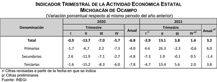 Durante el cuarto trimestre de 2021, Michoacán de Ocampo mostró un incremento anual de 1.4%, que resultó del crecimiento de las Actividades Secundarias y Terciarias de 0.5 y 2%, respectivamente, y de la contracción de 0.6% de las Primarias.