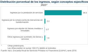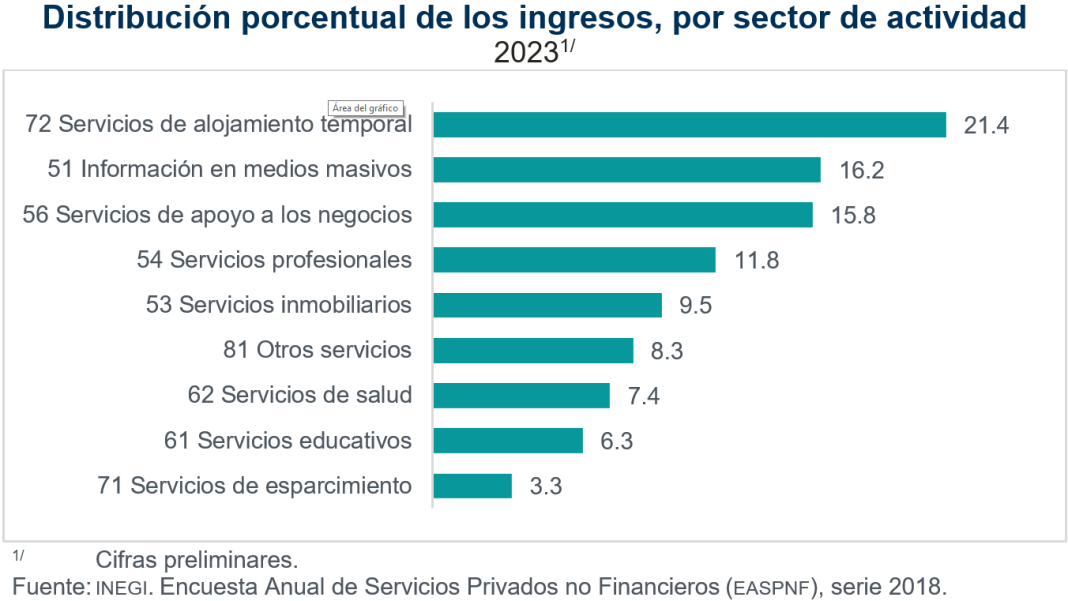En 2023, del total de ingresos de los servicios privados no financieros, 94.9% correspondió a la prestación de servicios y 2.4%, a la compraventa de mercancías sin transformación. Por sector de actividad, la mayor contribución a los ingresos correspondió a 72, Servicios de alojamiento temporal, con 21.4 por ciento. Siguieron 51, Información en medios masivos, con 16.2 y 56, Servicios de apoyo a los negocios, con 15.8%.