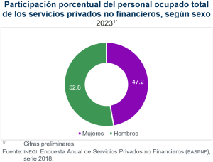 En 2023, del promedio de contratación en el agregado de los servicios privados no financieros, la participación del personal ocupado total fue de 47.2% de mujeres y 52.8% de hombres. En 2022, la participación se distribuyó de forma similar: 48.0% de mujeres y 52.0% de hombres.