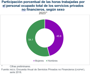 En el agregado de los servicios privados no financieros, la participación de horas trabajadas por las mujeres fue de 45.9% y la de hombres, de 54.1 por ciento. En 2022, la participación de horas trabajadas fue semejante: 46.8% de mujeres y 53.2% de hombres.