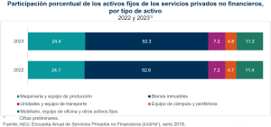 En 2022 y 2023, los bienes inmuebles registraron la mayor proporción de los activos fijos con 52.5%, en promedio. El equipo de cómputo y periféricos fue el activo fijo con menor inversión entre los establecimientos de servicios, con 4.8%.