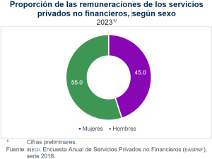 En 2023, en cuanto a las remuneraciones y su distribución según sexo, esta fue de 45.0% para mujeres y 55.0% para hombres, parecida a la de 2022: 45.6% para mujeres y 54.4% para hombres.