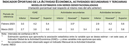 Para marzo de 2023, el IOAE estima una variación de 3.8 % a tasa anual del IGAE. Las estimaciones realizadas presentan sus respectivos intervalos de confianza a 95 % para los meses de febrero y marzo de 2023. En el mes de referencia, para los grandes sectores de actividad del IGAE, se calcula un incremento anual de 3 % en las actividades secundarias y de 4.2 % en las terciarias. Las estimaciones se refieren a cifras desestacionalizadas.