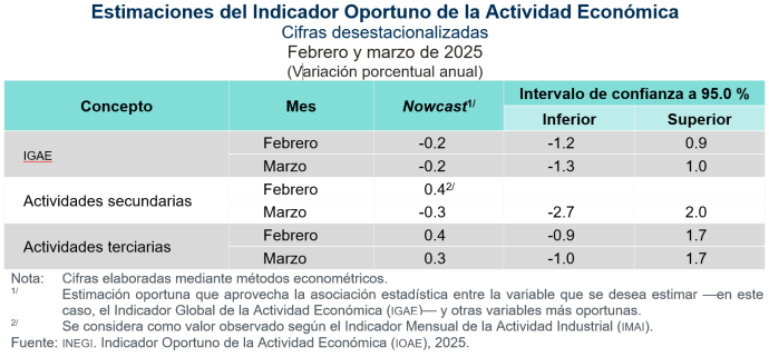 Para marzo de 2025, el IOAE estima un descenso anual de 0.2 % en el IGAE. Por grupos de actividad económica, se espera una baja anual de 0.3 % en las secundarias y un incremento de 0.3 % en las terciarias. Las estimaciones incluyen intervalos de confianza a 95.0 % y corresponden a cifras desestacionalizadas.