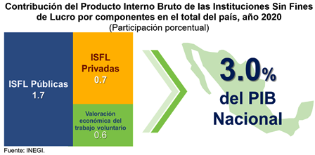 Durante 2020, el PIB de las ISFL alcanzó un monto de 647 mil 654 millones de pesos, que equivale al 3.0% del PIB Nacional. Por componentes, las ISFL Públicas representaron 1.7%, en tanto que las actividades de las ISFL Privadas contribuyeron con una participación de 0.7%. El restante 0.6% corresponde al valor económico del trabajo de los voluntarios.