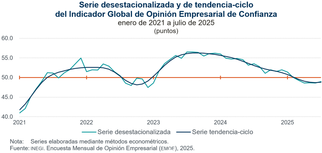 En julio de 2025 y con cifras desestacionalizadas, el IGOEC —que es el promedio ponderado de los indicadores de los cuatro sectores que lo integran— fue de 49.0 puntos y representó un alza de 0.4 puntos en relación con el mes anterior. En su comparación anual disminuyó 4.5 puntos. Con esta última observación, el indicador suma cinco meses seguidos por debajo del umbral de los 50 puntos.