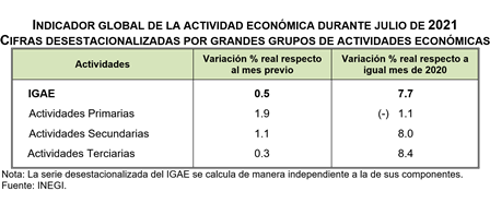 Por grandes grupos de actividades, las Primarias ascendieron 1.9%, las Secundarias crecieron 1.1% y las Terciarias lo hicieron en 0.3% durante julio de 2021 frente al mes precedente.
