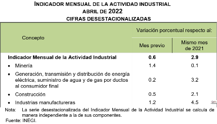 En abril de 2022 y con cifras desestacionalizadas, el Indicador Mensual de la Actividad Industrial (IMAI) aumentó 0.6 % a tasa mensual.
