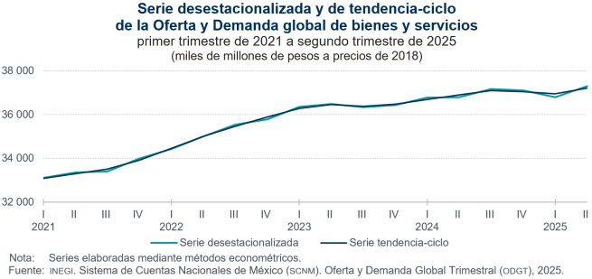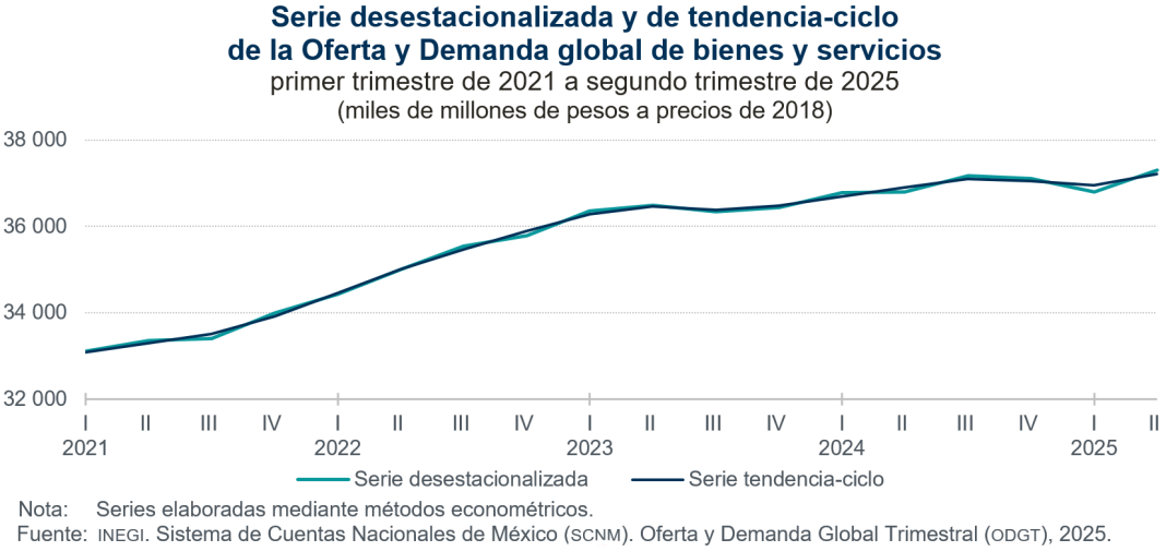 En el segundo trimestre de 2025, con cifras desestacionalizadas, la Oferta global de bienes y servicios (igual a la Demanda global) incrementó 1.4 %, en términos reales, respecto al trimestre previo.