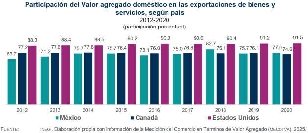 Entre 2012 y 2020, la participación del VADX en las exportaciones de Canadá bajó de 77.2 a 74.6 por ciento. En el mismo periodo, el VADX de Estados Unidos pasó de 88.3 a 91.5 por ciento. Lo anterior evidenció las capacidades productivas de cada país para producir internamente lo que vende al mundo: una mayor participación refleja menor dependencia de insumos importados.