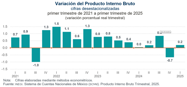 En el trimestre enero-marzo de 2025 y con cifras desestacionalizadas, el PIB registró un crecimiento de 0.2 % a tasa trimestral y un avance de 0.6 % a tasa anual, en términos reales.