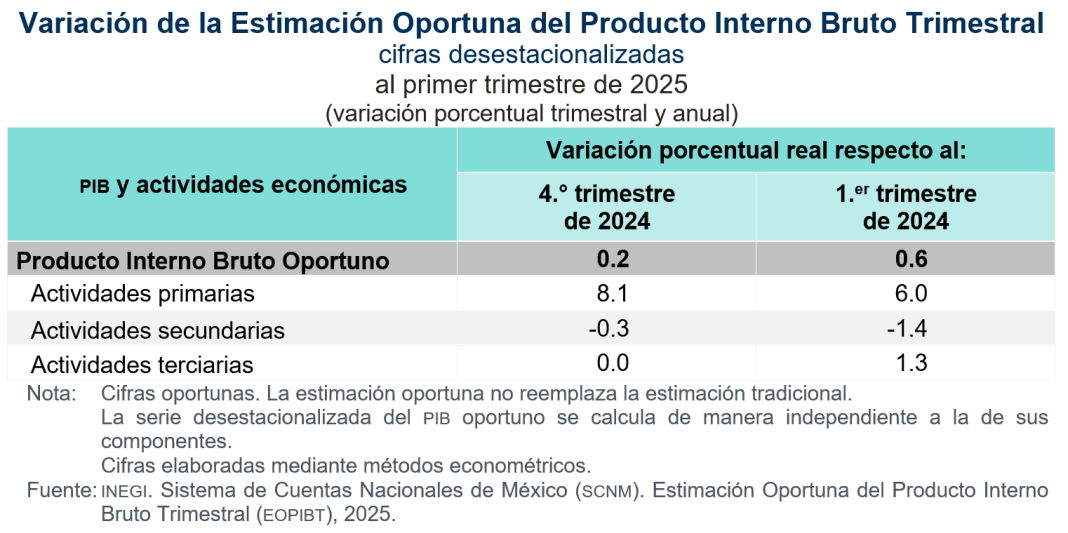 En el primer trimestre de 2025 y con cifras ajustadas por estacionalidad, los resultados de la EOPIBT indican que, el PIB creció 0.2 % en términos reales, con respecto al trimestre inmediato anterior (ver gráfica 1). A tasa anual, la estimación oportuna presentó un alza de 0.6 por ciento.