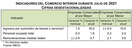 En las Empresas Comerciales al por Menor los Ingresos reales registraron un alza de 10%, las Remuneraciones medias reales de 3.6% y el Personal ocupado total de 2.4% en el mes de referencia frente a julio de 2020, con series ajustadas por estacionalidad.