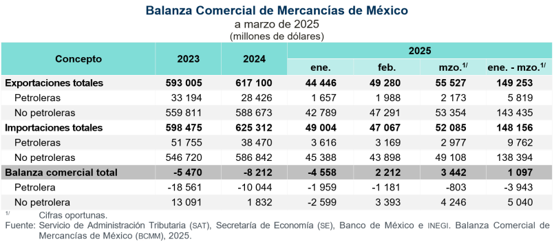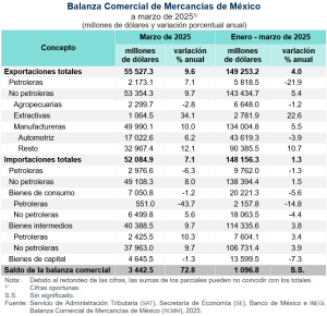 Para el primer trimestre de 2025, la balanza comercial presentó un superávit de mil 097 millones de dólares. En el mismo periodo de 2024 registró un déficit de 2 mil 706 millones de dólares.