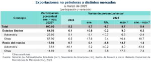 En el tercer mes del año en curso, el valor de las exportaciones fue de 55 mil 527 millones de dólares, monto superior en 9.6 % al del mismo mes de 2024. Dicha tasa resultó de crecimientos de 9.7 % en las exportaciones no petroleras y de 7.1 % en las petroleras.