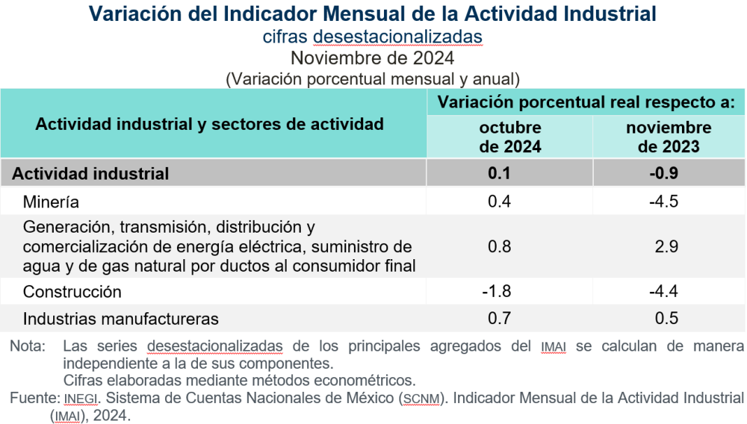 En noviembre de 2024, con cifras desestacionalizadas, la actividad industrial incrementó 0.1 % con respecto a octubre pasado, en términos reales. A tasa anual disminuyó 0.9 %.
