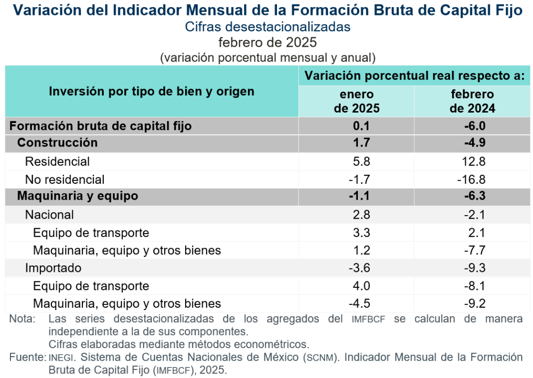 En febrero de 2025 y con cifras desestacionalizadas, la formación bruta de capital fijo incrementó 0.1 % respecto al mes previo, en términos reales. A tasa anual, disminuyó 6.0 por ciento.