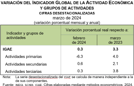 En marzo de 2024 y con cifras desestacionalizadas, el IGAE aumentó 0.3 % a tasa mensual.