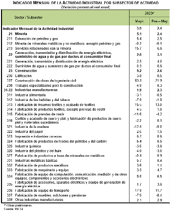 A tasa anual y con series desestacionalizadas, el IMAI avanzó 2.8 %, en términos reales, en mayo pasado. Por sector de actividad económica, Construcción incrementó 8.1 %; Minería, 5.1 %; Generación, transmisión y distribución de energía eléctrica, suministro de agua y de gas por ductos al consumidor final, 1.7 % e Industrias manufactureras, 0.3 por ciento.