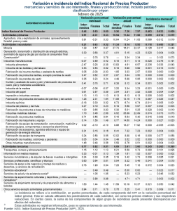 En febrero de 2025, por grandes grupos de actividades económicas, los precios de las primarias subieron 0.91 % a tasa mensual y 10.94 % a tasa anual. Los de las secundarias ascendieron 0.21 % a tasa mensual y 11.34 % a tasa anual. Los precios de las actividades terciarias mostraron un alza de 0.77 % a tasa mensual y de 6.09 % a tasa anual.