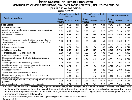En abril de 2023, el Índice Nacional de Precios Productor (INPP) total, incluyendo petróleo, aumentó 0.20 % a tasa mensual y 1.41 % a tasa anual. En el mismo mes de 2022, creció 0.60 % a tasa mensual y 10.50 % a tasa anual.