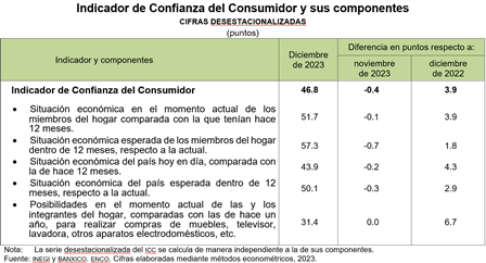 En diciembre de 2023 y con datos ajustados por estacionalidad, el Indicador de Confianza del Consumidor (ICC) se ubicó en 46.8 puntos, nivel que implicó una disminución mensual de 0.4 puntos.