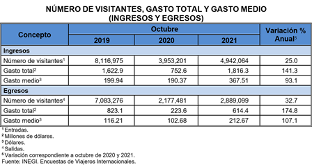 Las divisas que egresaron del país por concepto de visitantes internacionales fueron de 614.4 millones de dólares, mientras que en octubre de 2020 fueron de 223.6 millones y para el mismo mes de 2019 alcanzaron los 823.1 millones de dólares.