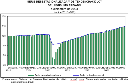 Por componente, en el último mes de 2023 y con datos ajustados por estacionalidad, el consumo de bienes y servicios de origen nacional ascendió 0.4 % y el de bienes de origen importado disminuyó 0.9 por ciento.