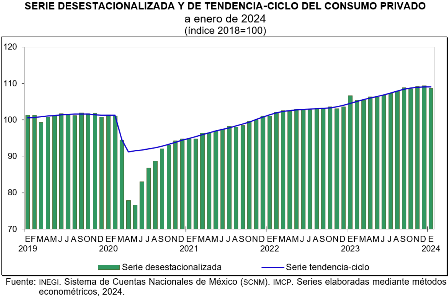 En enero de 2024 y con cifras desestacionalizadas, el consumo privado disminuyó 0.6 % con respecto a diciembre pasado, en términos reales.