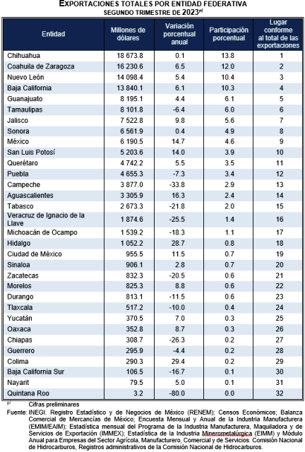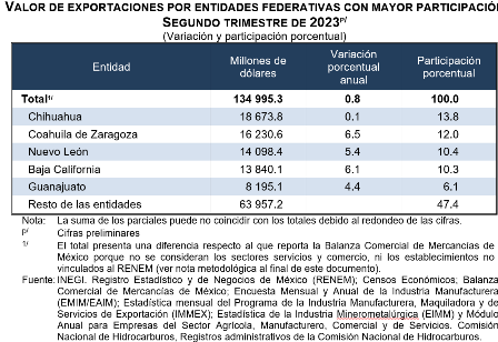 En el segundo trimestre de 2023, los estados con mayor contribución al valor total de las exportaciones fueron: Chihuahua (13.8 %), Coahuila de Zaragoza (12 %), Nuevo León (10.4 %), Baja California (10.3 %) y Guanajuato (6.1 %). En conjunto, estas entidades sumaron 52.6 por ciento. Michoacán contribuye con el 1.1 por ciento.