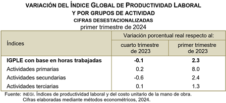 En el primer trimestre de 2024, por sector de actividad y con series desestacionalizadas, la productividad laboral —con base en las horas trabajadas— en los establecimientos manufactureros creció 2.3 por ciento. La productividad —con base en el personal ocupado total— en las empresas de servicios privados no financieros incrementó 0.8 por ciento. En las de comercio al por menor retrocedió 1.4 % y en las constructoras, 4.0 por ciento. En las de comercio al por mayor no presentó variación a tasa trimestral.