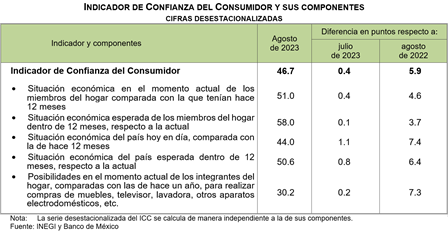 En agosto de 2023 y con datos ajustados por estacionalidad, el Indicador de Confianza del Consumidor (ICC), elaborado de manera conjunta por el Instituto Nacional de Estadística y Geografía (INEGI) y el Banco de México, se situó en 46.7 puntos, que representó un aumento mensual de 0.4 puntos.