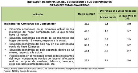 En marzo de 2022 y con cifras desestacionalizadas, el Indicador de Confianza del Consumidor (ICC), elaborado de manera conjunta por el INEGI y el Banco de México, presentó un aumento mensual de 0.4 puntos.