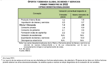 En el primer trimestre de 2022 y con series ajustadas estacionalmente, la Oferta global de bienes y servicios (igual a la Demanda global) aumentó 1.2 % en términos reales respecto al trimestre previo. A su interior, el Producto Interno Bruto creció 1 % y las Importaciones de bienes y servicios, 2.5 por ciento.