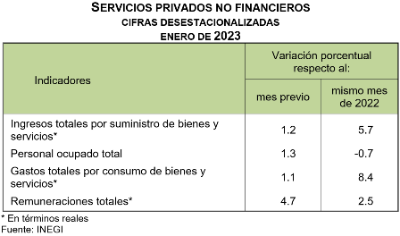 En enero de 2023 y con datos ajustados por estacionalidad, los resultados de la Encuesta Mensual de Servicios (EMS) indican que los ingresos totales reales por suministro de bienes y servicios de los servicios privados no financieros crecieron 1.2 %; el personal ocupado total, 1.3 %; las remuneraciones totales reales, 4.7 % y los gastos totales por consumo de bienes y servicios -importe que destinaron establecimientos o empresas al consumo de bienes y servicios para realizar su actividad económica-, 1.1 %, a tasa mensual.
