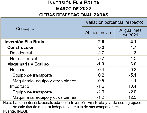 En marzo de 2022 y con cifras desestacionalizadas, la Inversión Fija Bruta aumentó 2.9 % a tasa mensual.