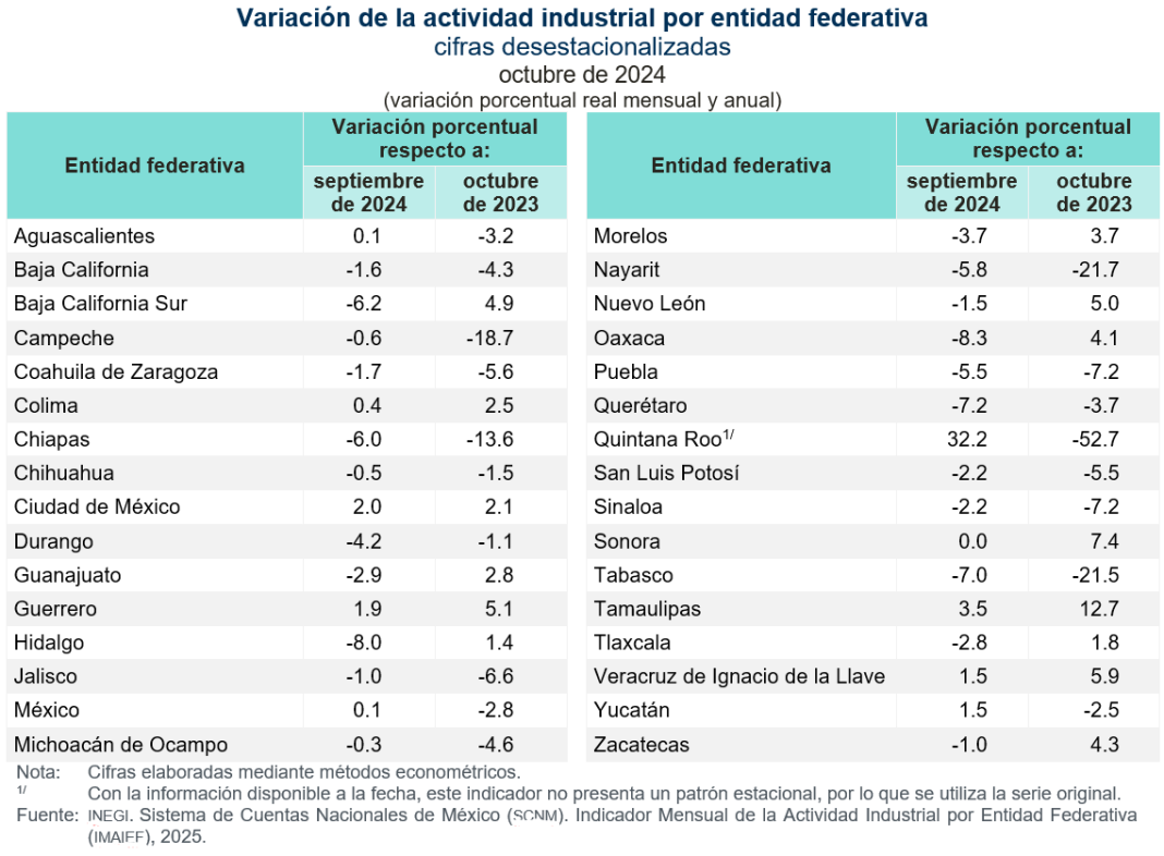 En octubre de 2024 y con cifras desestacionalizadas, la actividad industrial registró los mayores incrementos en Quintana Roo, Tamaulipas, Ciudad de México, Guerrero, Veracruz y Yucatán, con respecto a septiembre pasado, en términos reales).